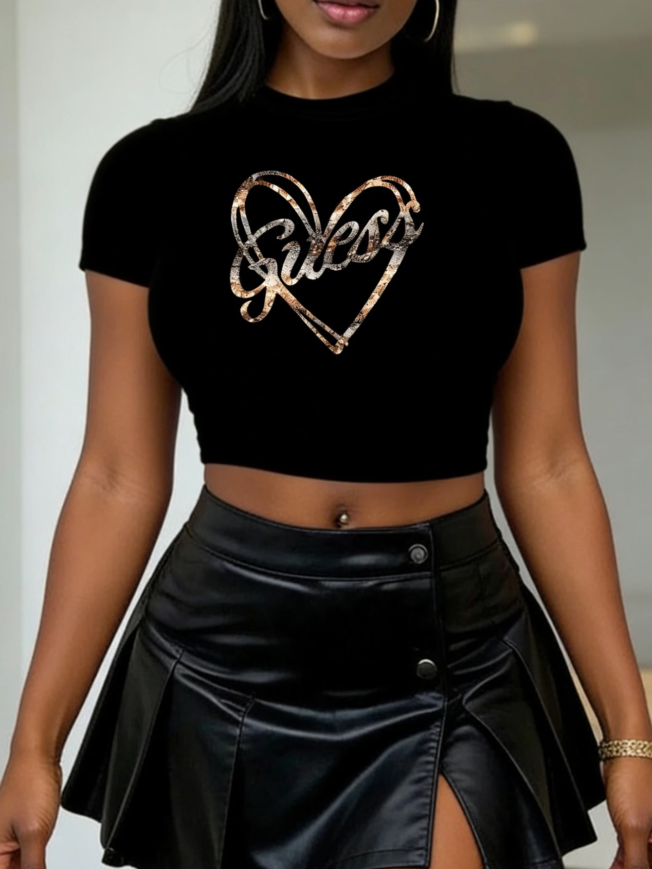 تي شيرت نسائي بأكمام قصيرة وطباعة قلب ريترو، ضيق وبدون أكمام، ملابس نسائية