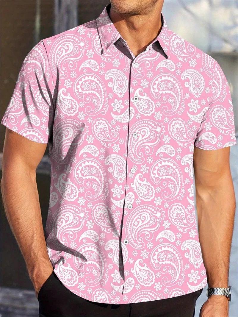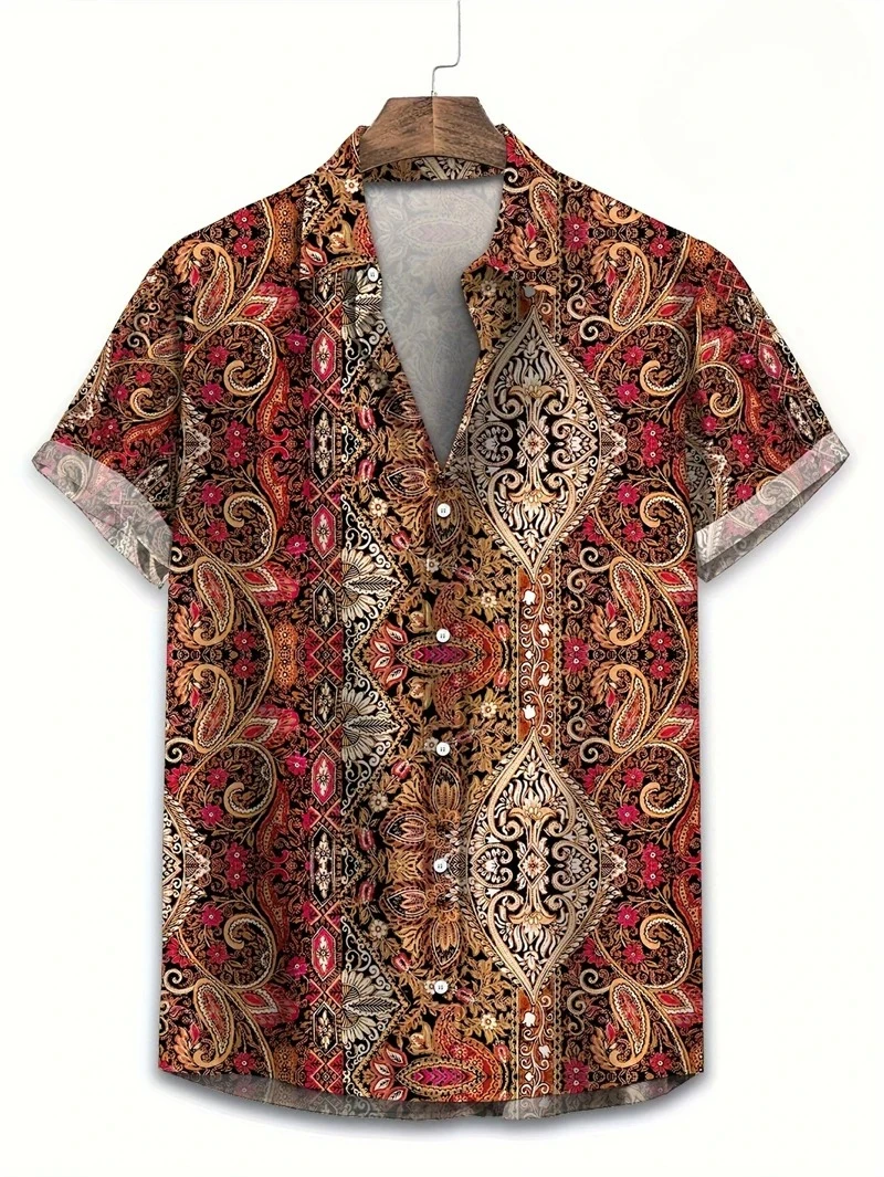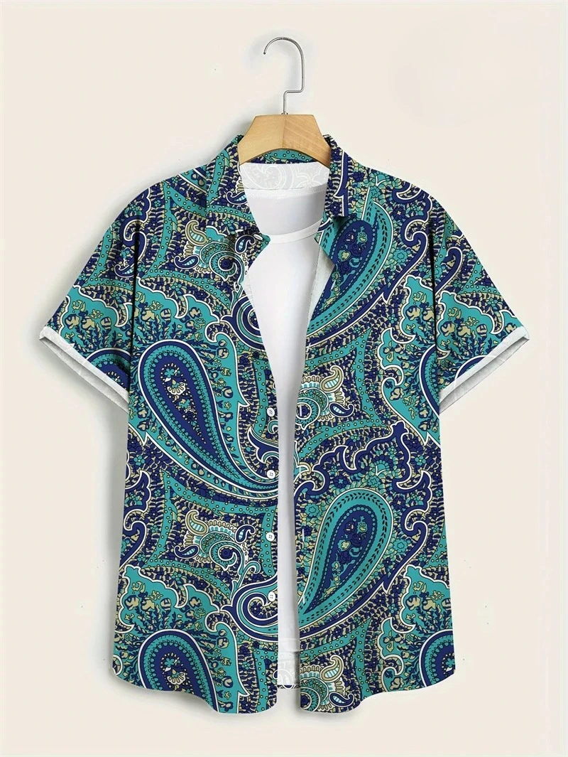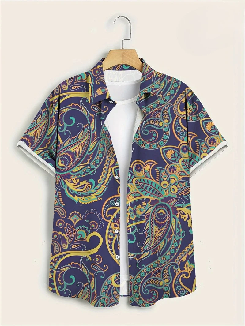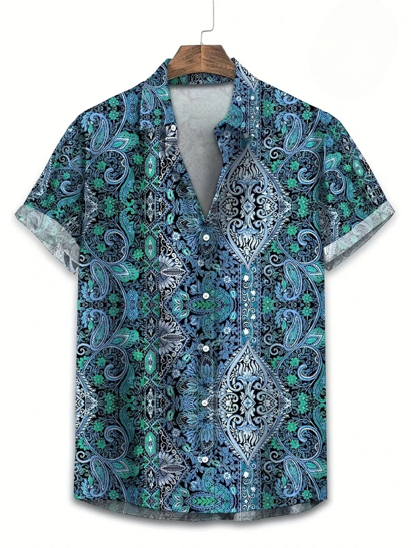 هاواي قمصان للرجال ثلاثية الأبعاد بيزلي الجرافيك قصيرة الأكمام تي شيرت عادية التلبيب أزرار الذكور بلايز الصيف المتضخم البوهيمي رجل تيز